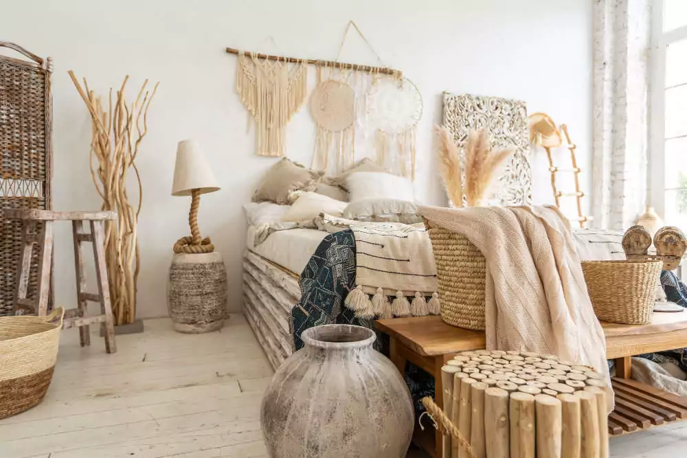 Styl boho preferuje materiały naturalne i przyjazne środowisku. W aranżacjach dominują drewno, wiklina, rattan, bambus oraz naturalne tkaniny. Te surowce wprowadzają do wnętrza ciepło i przytulność.