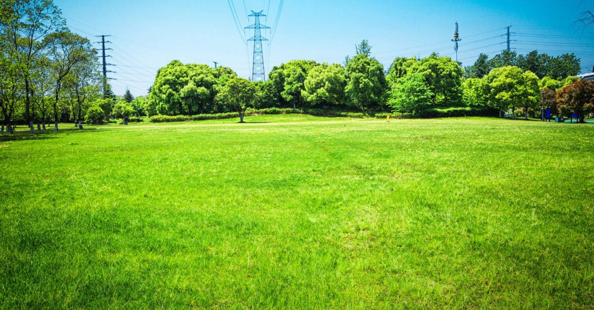 duży zielony trawnik z czerwonymi krzewami w tle
